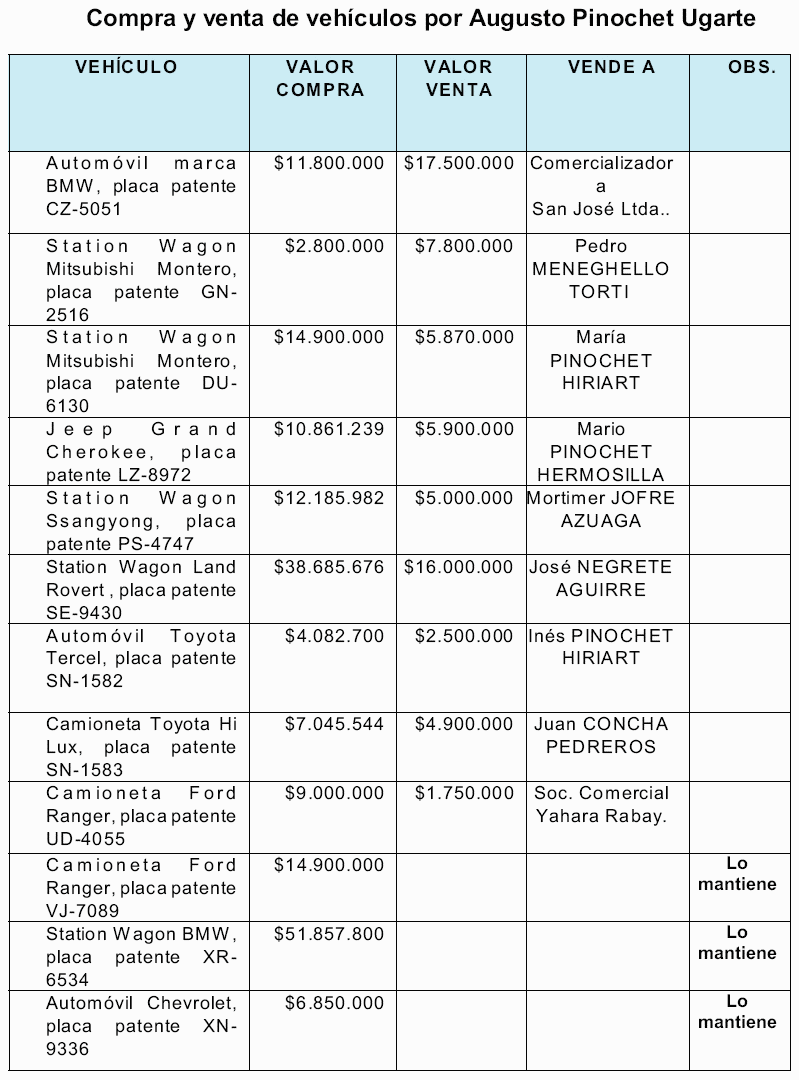 Inversiones en Chile.- Con los antecedentes recopilados, se ha constatado que Augusto José Ramón Pinochet Ugarte, como persona natural registra las siguientes operaciones de compra y venta de bienes en Chile: