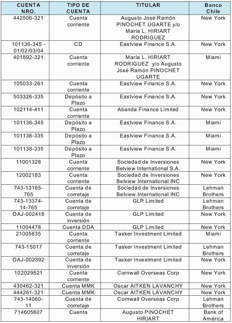 Inversiones en el extranjero.- Efectuado el recuento de los distintos depósitos y con la documentación reunida hasta ahora por el tribunal, en cuanto a capital, intereses y dividendos, de las inversiones de Augusto Pinochet Ugarte y Lucía Hiriart Rodríguez en el extranjero, suman un total de US $ 26.992.712,02. Los cuales resultan de la suma de cuentas en los Bancos Riggs de Londres; Riggs Washington; Riggs Miami; Espirito Santo de Miami; Banco de Chile Nueva York; Banco de Chile Miami, Lehman Brothers N.Y., Coutts Bank de Miami, Citibank N.Y., Citibank Miami, Cititrust Bahamas Limited, Firts National City Bank, Firts Tulsa a Bank of Amèrica, a lo que se suman transferencias de fondos desde los Bancos Atlántico de Nueva York; Banco Atlántico de Gibraltar; Banco Atlántico se Zurich; Bank of Bahamas; Sun Bank de USA; Swiss Corp; Bank of América; American Express Bank N.Y., Banco Océano Miami. Los cuales se desglosan en US$258.818,72 correspondientes al total de intereses generados por los saldos mantenidos en las cuentas; US$4.419.464,64 correspondientes al total de los intereses ingresados a las cuentas producto de los certificados de depósito, intereses de inversiones a través de las cuentas, dividendos obtenidos de los trusts, utilidades de inversiones y; US$22.314.432,66 correspondientes al total de los depósitos de capital ingresados a estas cuentas.
