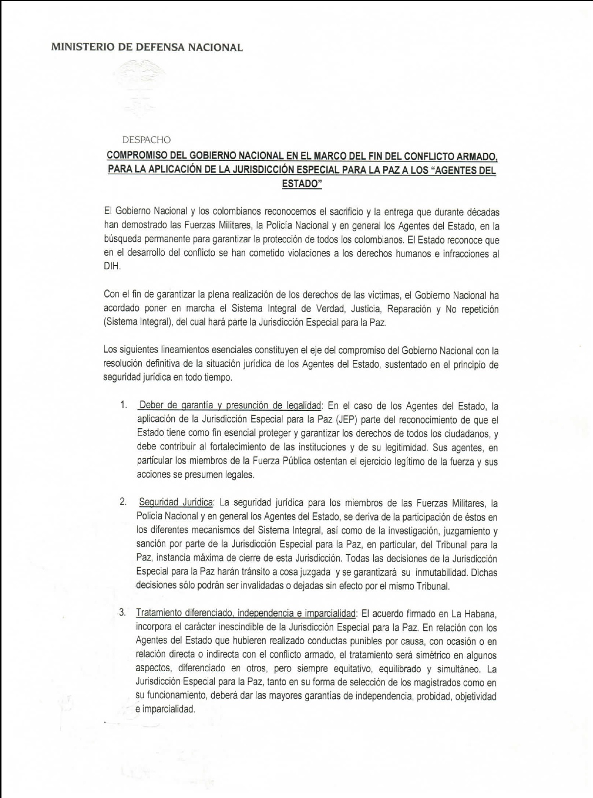El Gobierno Nacional y los colombianos reconocemos el sacrificio y la entrega que durante décadas han demostrado las Fuerzas Militares, la Policía Nacional y en general los Agentes del Estado, en la búsqueda permanente para garantizar la protección de todos los colombianos. El Estado reconoce que en el desarrollo del conflicto se han cometido violaciones a los derechos humanos e infracciones al DIH.