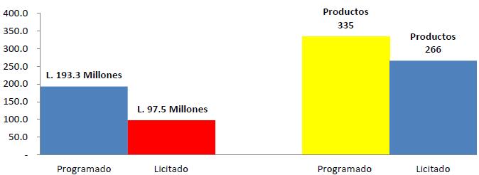 El Gráfico No.10 permite analizar dos hallazgos, el primero muestra que de L. 193.3 millones programados, se licitaron L. 97.5 millones por parte del Secretaría, lo que significa que el HE recibiría en su almacén de medicamentos, únicamente el 50.5 % de la necesidad denominada en lempiras, identificada por el departamento de farmacia. Visto desde la perspectiva de los productos, dentro de la licitación se incluyeron 266 medicamentos de los 335 programados, dejando por fuera un total de 69 productos.