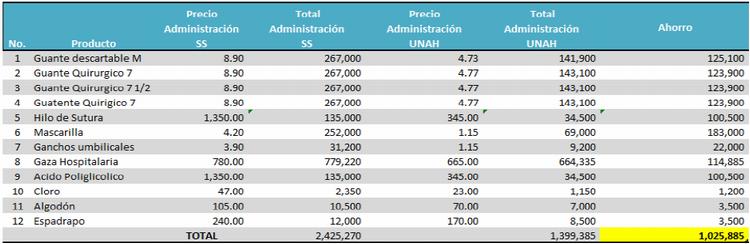 Es importante destacar que estas diferencias se obtuvieron, a pesar de haber realizado compras en volúmenes bajos, debido a la falta de disponibilidad presupuestaria, sin embargo esto no fue obstáculo para que los proveedores ofertaran estos precios. Esta situación es interesante, debido a que se presume que a través de los procesos de licitación, se obtienen precios más competitivos, por las grandes cantidades de productos que compran, desafortunadamente esos beneficios no han aplicado en el HE.