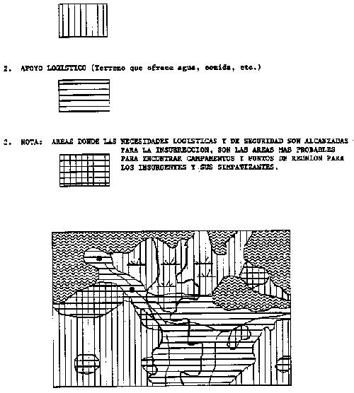 c. Logística. Otro calco que podría ser de utilidad es el de logística. En este calco el analista identifica aquellas áreas que proveen agua, y comida al insurgente, o aquellas que por su localización tienen acceso fácil a fuentes de abastecimiento logístico.